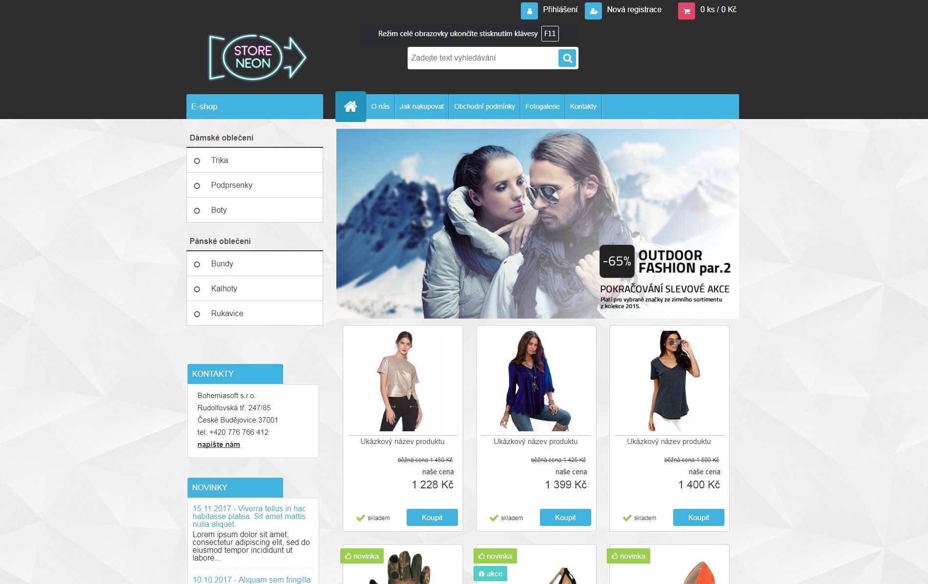 NEON je naše klasická, univerzální šablona. Na úvodní straně je navíc využito efektu pro zobrazení detailu obrázku produktu, po najetí myši na box produktu: