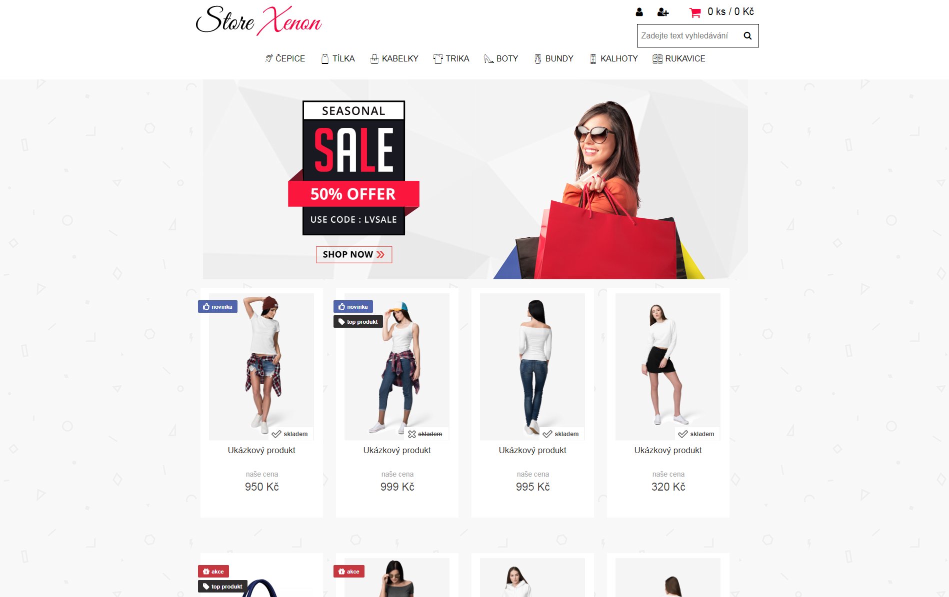 Elegantní šablona s horizontálním produktovým menu v hlavičce stránky, s článkovým menu v patičce eshopu a pevnou šířkou stránky.