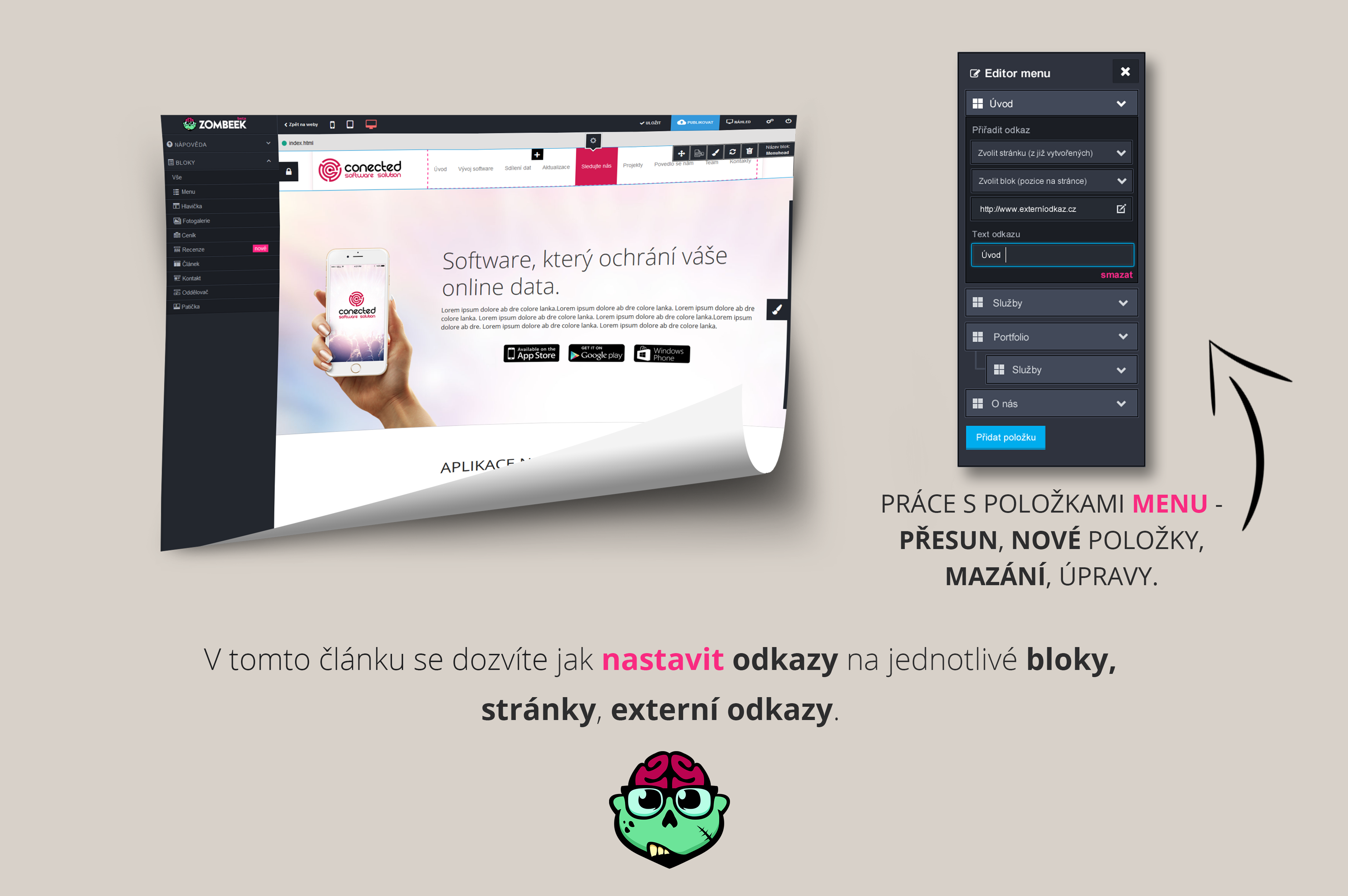 Již jste si založili svůj web na Zombeek.cz? Připravujeme pro vás video návody, které vám pomohou s co nejrychlejším pochopením ovládání funkcí Zombeeka. Ovládněte systém naplno a vytvořte svůj dokonalý web. Dnes se naučíte pracovat se všemu funkcemi, které uplatníte u tvorby MENU.