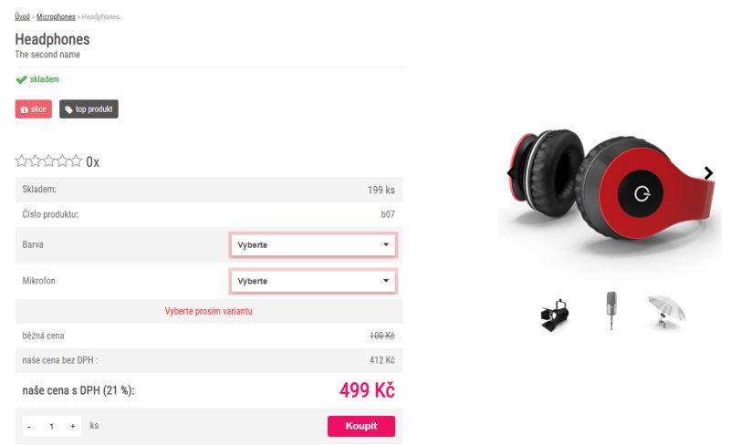 V případě, že prodáváte produkt, u kterého je nutné zvolit parametry číselníku – například u produktu „Headphones“ musíte pro jeho objednání ještě zvolit jeho barvu a zda objednáváte variantu s nebo bez mikrofonu. Díky těmto parametrům může být samozřejmě i výsledná cena produktu zcela jiná, než základní model bez parametrů.